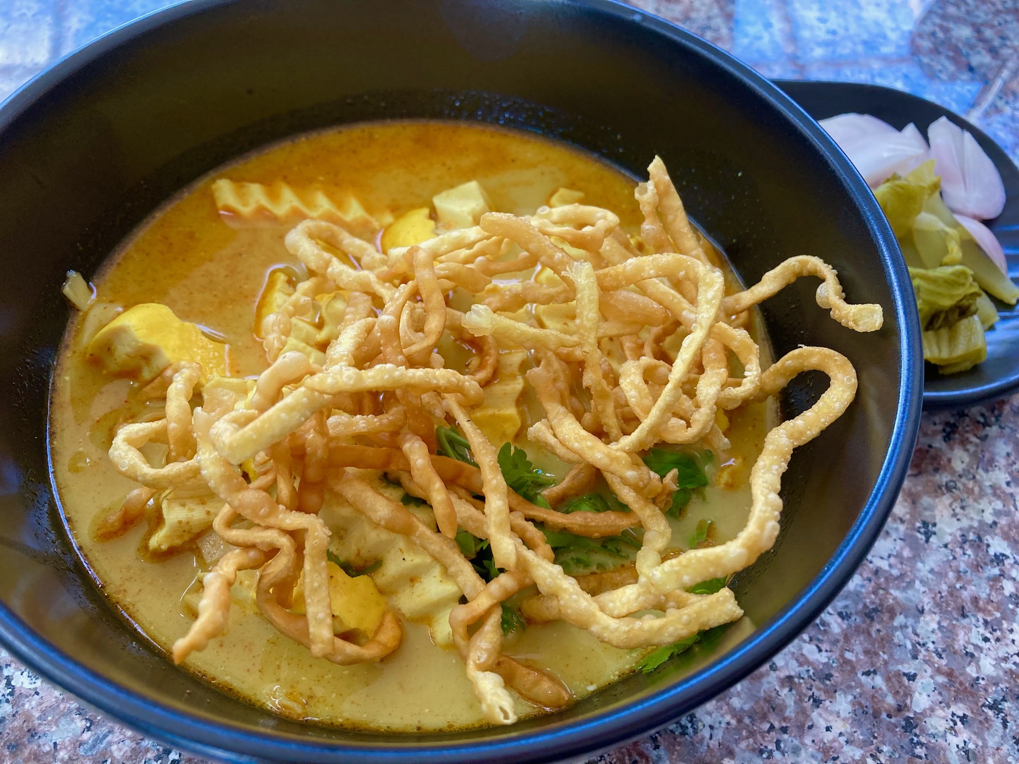カオソイとは、タイの北部でよく食べられている、生麺と揚げたたまご麺をカレー風味のスープに入れた麺料理。