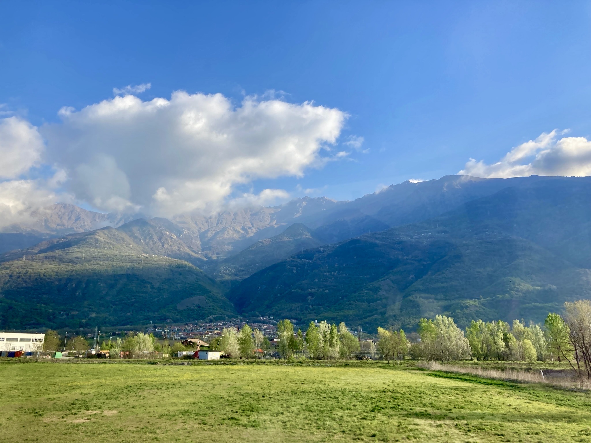 近くにアルプスがあるので、キレイな山がそびえ立ち、奥には雪がかかった山も見えます。