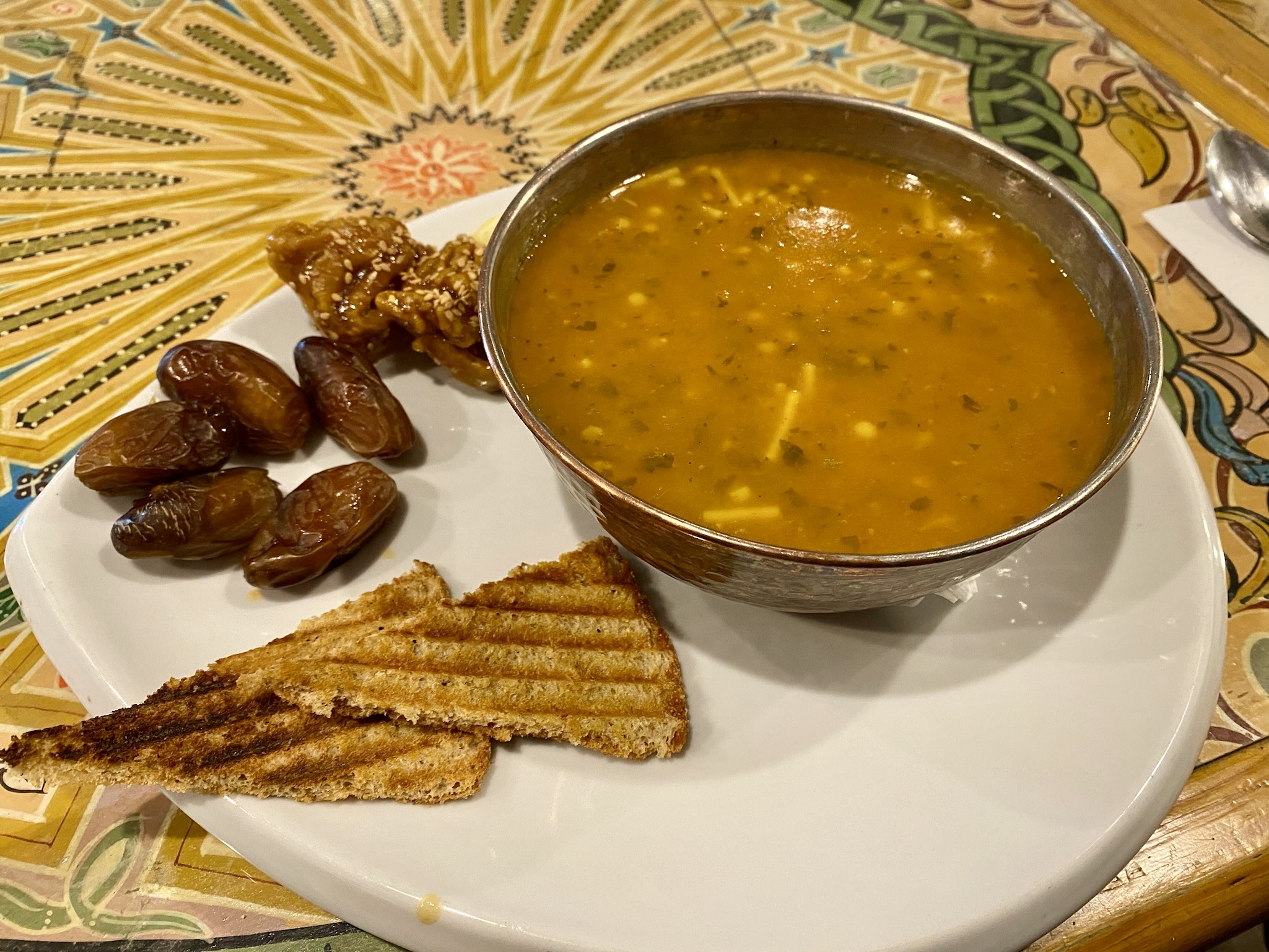 横に添えられているのはトーストの他に、デーツという甘いフルーツ、そしてチェバキアというゴマ生地の甘いデザート。スープの箸休め的な存在なのでしょうか。面白い組み合わせです。